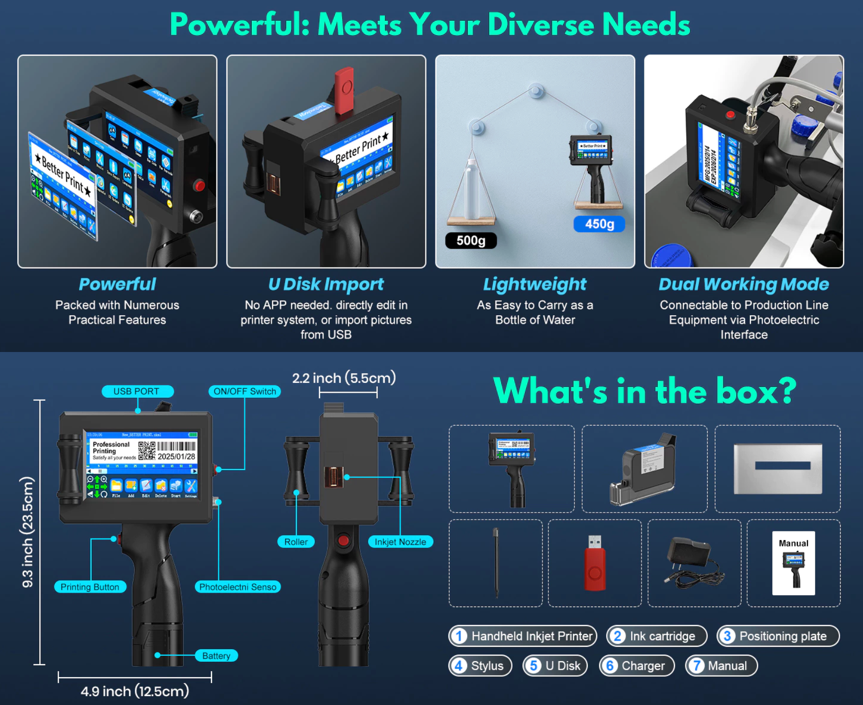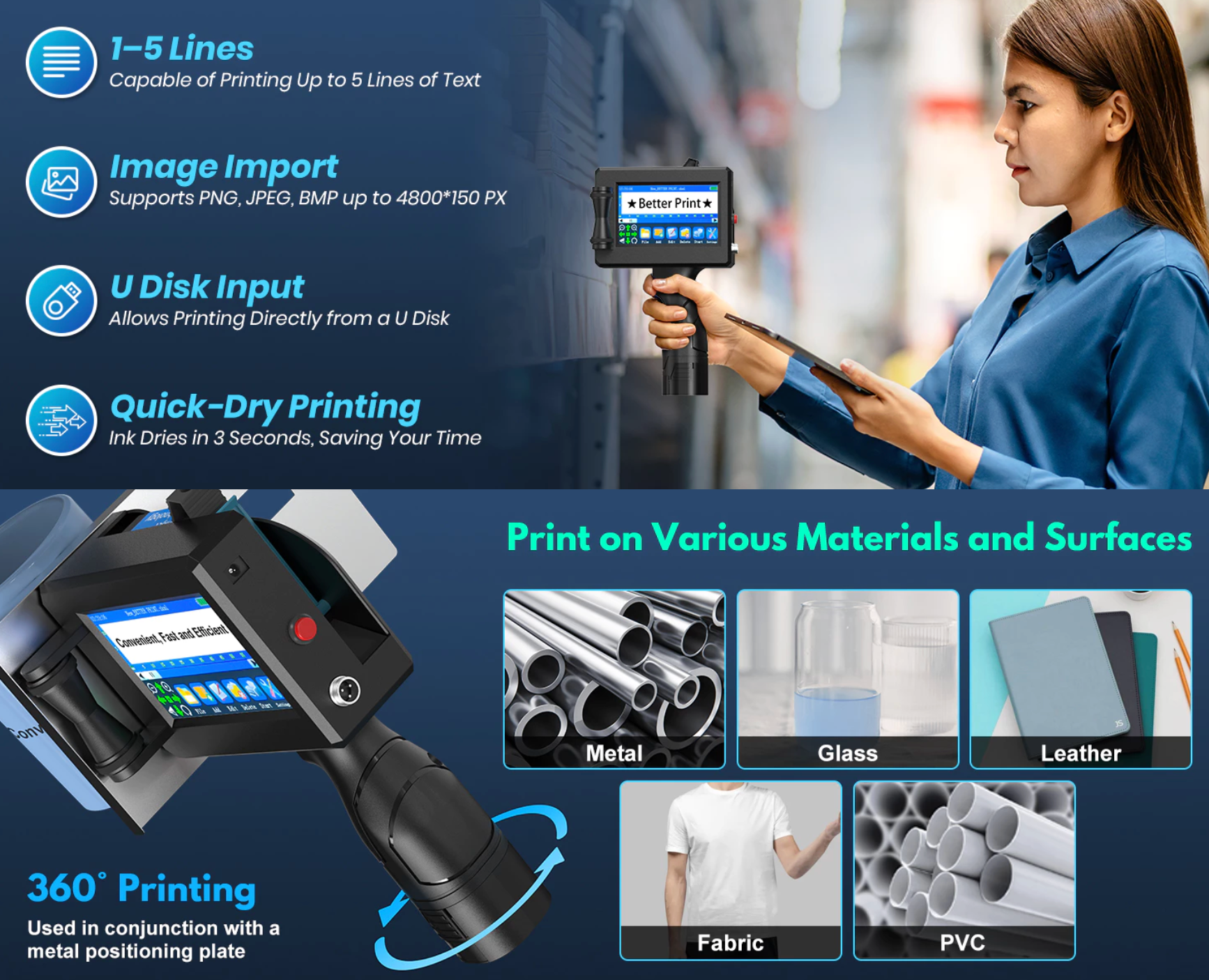 The Better Print Handheld Inkjet Printer is a high-performance, portable coder capable of 360° marking on virtually any material (Metal, Glass, PVC, Wood, Leather, etc.). It prints 1-5 lines of Text, Barcodes, QR Codes, and Images with ink that dries in just 3 seconds.
