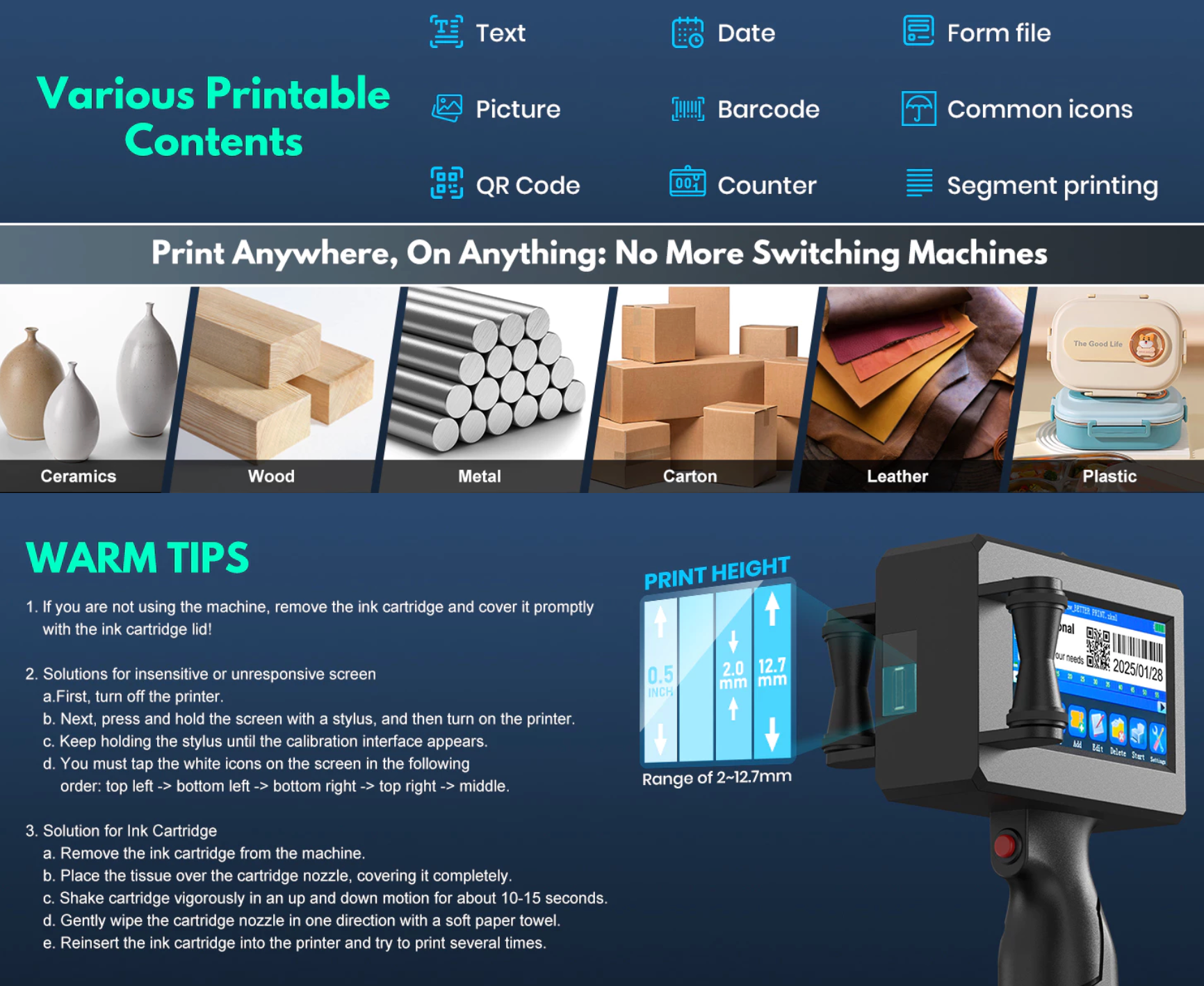 Ultimate Material Compatibility: Print crisp text, dates, and codes on virtually any surface, including Metal, Glass, PVC, Leather, Fabric, Wood, Carton, Ceramics, and Plastic.