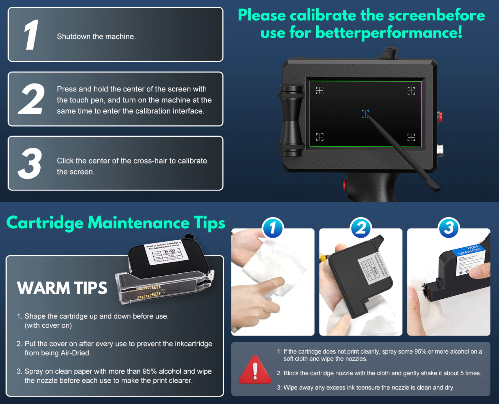 For optimal performance, please calibrate the screen upon first use. Simply shut down the machine, press and hold the center of the screen with the touch pen while turning it on to access the calibration interface, and then click the center of the cross-hair.